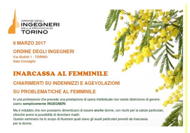 PROGRAMMA: 14.30 – Saluti del Presidente Valter Ripamonti e del Vice Presidente Fulvio Giani 14.45 – Saluti del delegato Inarcassa Torino (ing. Stefano Sapienza) 15.00 – Perché Inarcassa al femminile – le esperienze personali di due Colleghe (ingg. Fabrizia Giordano e Patrizia Vanoli) 15.30 – Indennizzi e agevolazioni per problematiche di salute, maternità, interruzioni involontarie…